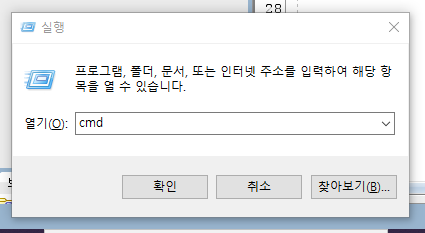2. 실행의 열기에 cmd를 입력한 후 확인 버튼을 눌러준다.